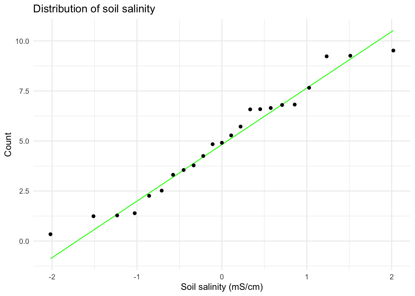 aes(sample = salinity_mS_cm)) + # uses salinity_mS_cm variable
