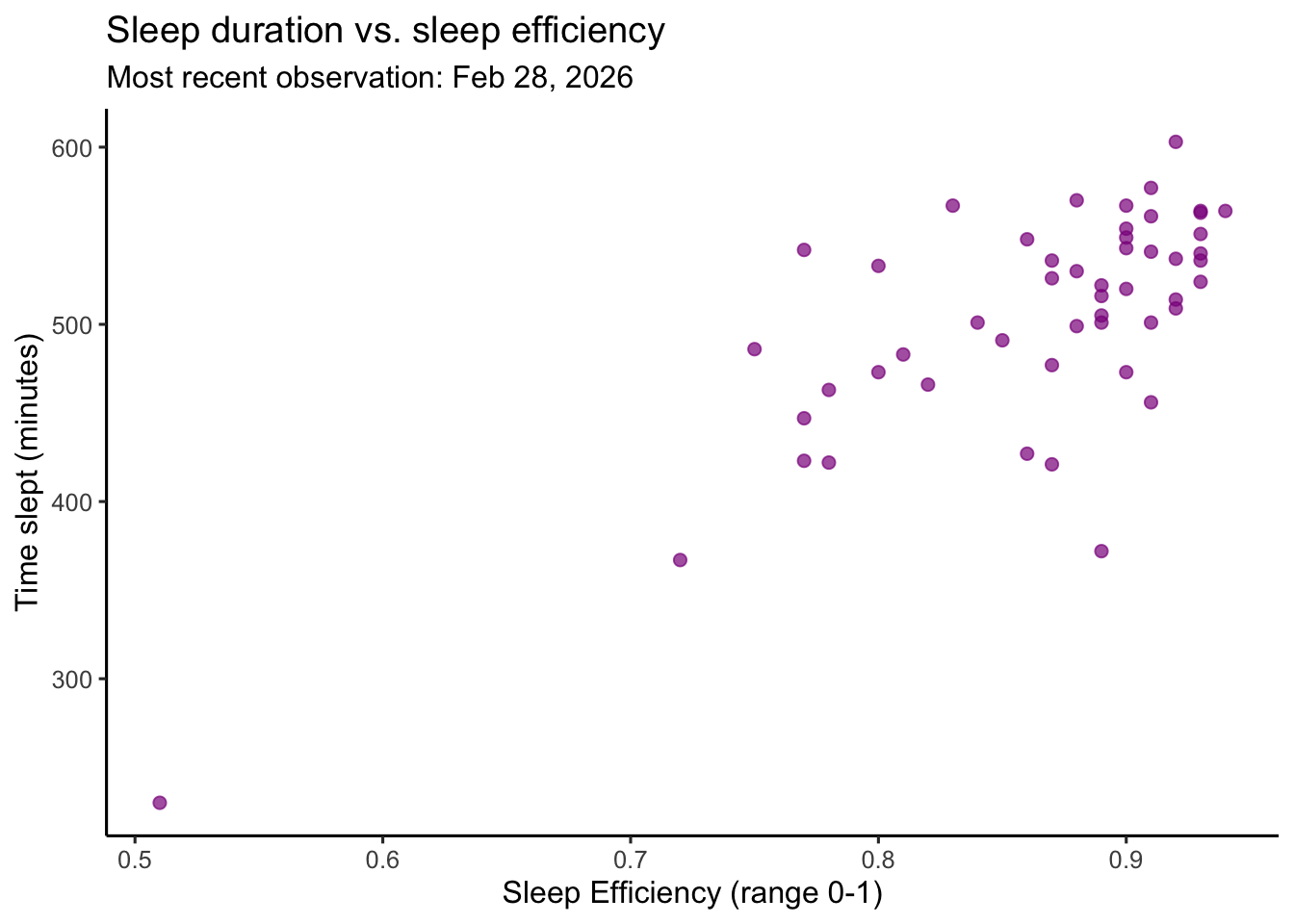 Figure 2. Sleep duration is associated with sleep effciency (as measured by the Oura Ring). Magenta circles represent individual daily observations of time slept (minutes) plotted against sleep efficiency (ranging 0-1 with 1 indicating 100% efficiency and 0 indicating 0% efficiency). Each scatterplot point corresponds to a single recorded day. Sleep efficiency as defined by Oura is the percentage of time you were asleep while you were in bed. The subtitle indicates the most recent observation included in the dataset. Data represent personal daily tracking records collected between January–February 2026 using an Oura ring.