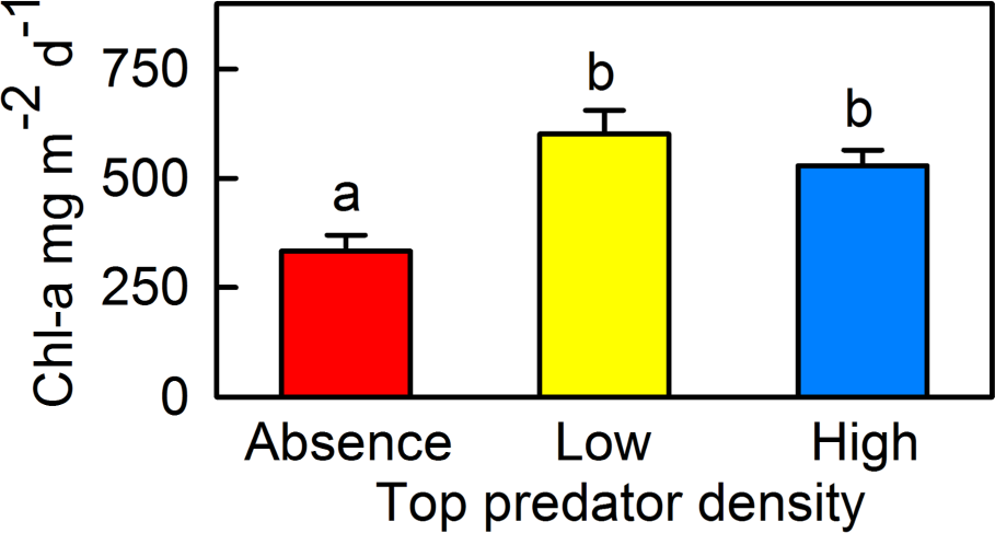 The authors clearly present the primary comparison by placing predator density categories on the x-axis and chlorophyll-a concentration on the y-axis, which creates a logical and intuitive layout. The figure shows summary statistics using mean values with error bars representing standard error, and uses letter groupings (“a” = absent, “b” = barbels) to indicate statistically significant differences among treatments. While this approach communicates statistical comparisons efficiently, the figure only displays summary values and does not show the underlying data points. As a result, it is difficult to assess the distribution of observations, sample size, or the presence of potential outliers.