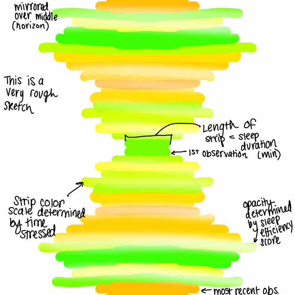Inspired by warming stripes and quilt art, I could create a visualization where each day is represented by a horizontal strip arranged chronologically from top to bottom. The color of each strip would represent time stressed with the number of the hue determined by the minutes spent stressed. The opacity of each strip would represent sleep efficiency (measured as a percentage), with more opaque colors indicating higher efficiency. The length of each strip would represent time slept, so longer strips indicate more sleep. The design would mirror the strips across the center of a square layout, creating a quilt-like pattern that highlights changes/patterns in stress and sleep over time.